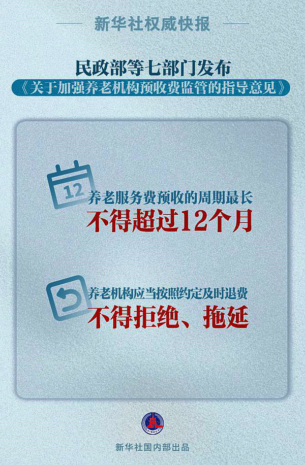 新華社北京5月10日電(記者高蕾)記者10日從民政部2024年第二季度例行新聞發(fā)布會上獲悉,民政部等七部門近日印發(fā)《關(guān)于加強(qiáng)養(yǎng)老機(jī)構(gòu)預(yù)收費(fèi)監(jiān)管的指導(dǎo)意見》,對預(yù)收費(fèi)用收取要求、使用用途等進(jìn)行規(guī)定。