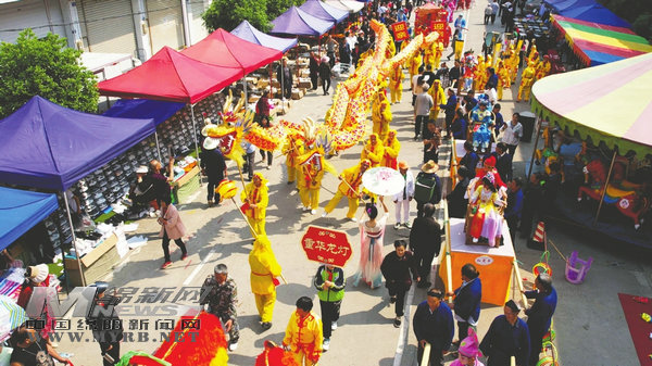 開幕式演出后,民俗文化巡游出場。經(jīng)典戲劇人物、舞獅舞龍、采蓮船……各種富有中華傳統(tǒng)文化色彩的民俗元素組成一條長長的“彩龍”,浩浩蕩蕩地游走在古鎮(zhèn)的大街小巷,所到之處引發(fā)游客和鄉(xiāng)親們爭相圍觀、拍照。