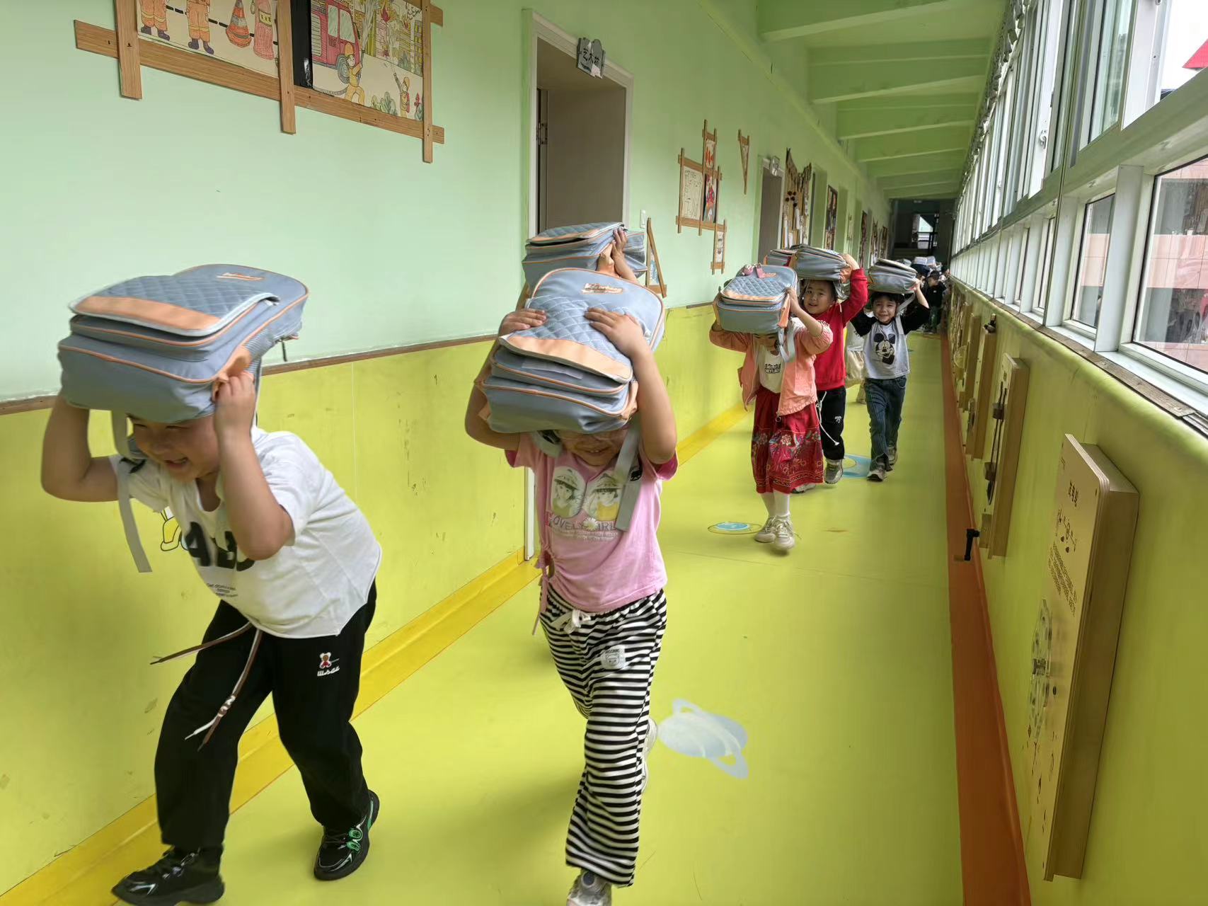 其次,開展“安全疏散——演練”活動。當日上午10:00分左右,第一次警報響起,師幼立刻停止一切活動,教師迅速組織幼兒躲避,一樓幼兒有序撤離到安全地帶;第二次警報拉響,剩余幼兒按照預定的疏散路線向著安全地帶撤離。該園相關(guān)負責人及各通道負責人員第一時間到達指定位置,協(xié)助指揮保護孩子們向安全地帶撤離。整個疏散過程用時2分19秒,所有人員安全到達指定疏散地點。
