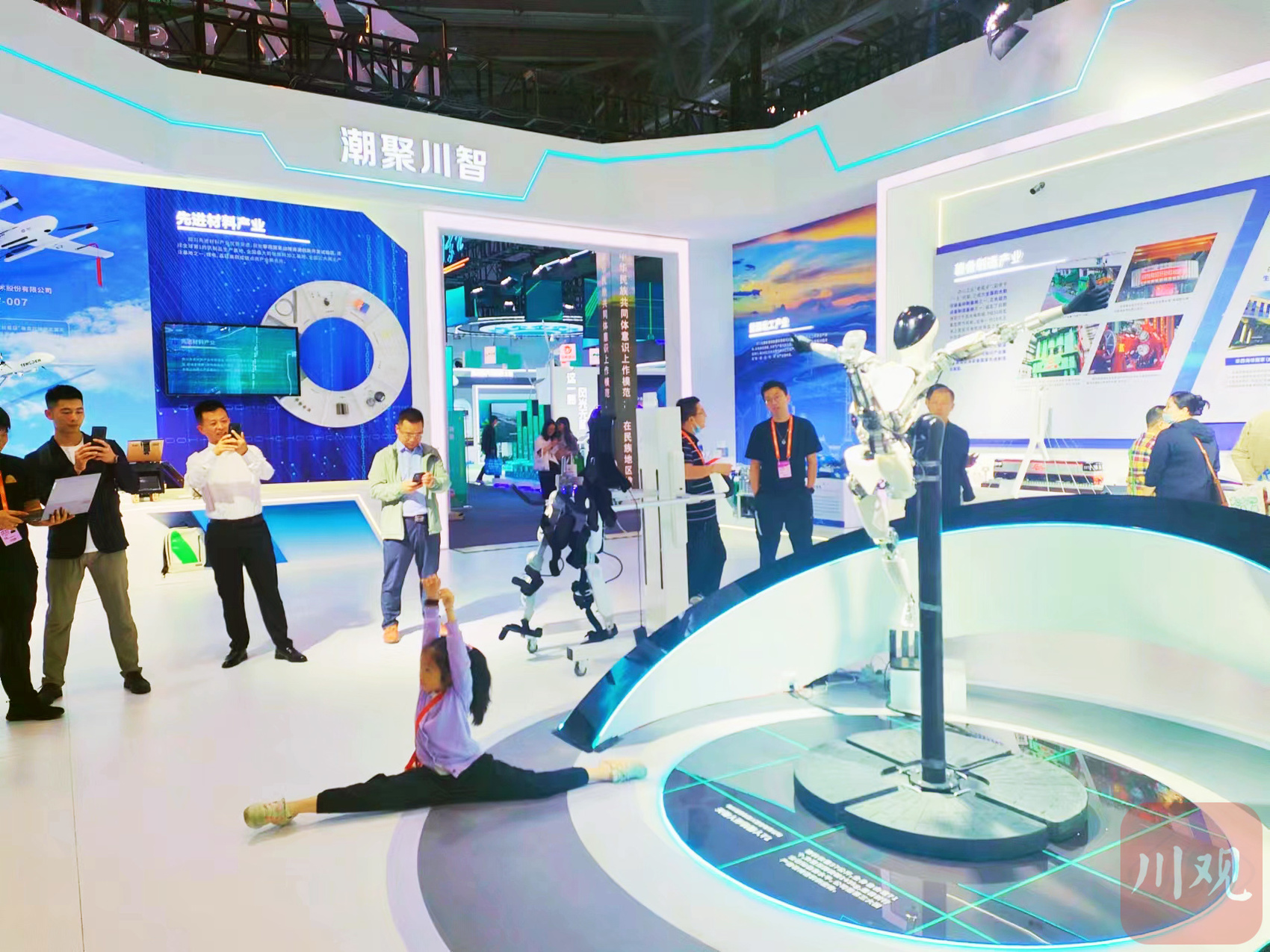 參觀的小朋友與人形機(jī)器人較量“一字馬”。