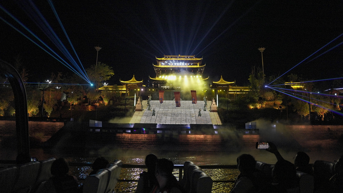 游客乘船觀看大型沉浸式夜游演出《恩陽船說》。施皓文 攝