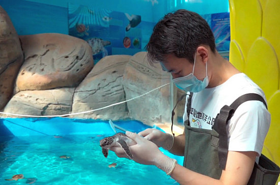 海合安成都極地海洋公園對放流小海龜進行檢查