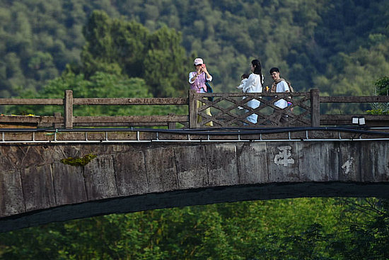 5月2日,游客在富春山鎮(zhèn)茆坪村的一座橋上賞景。富春江的一條支流蘆茨溪穿村而過(guò)。新華社記者 黃宗治 攝