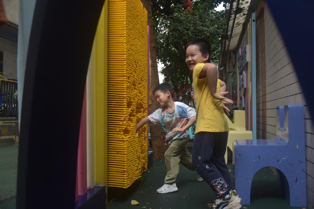 在廣州市越秀區(qū)的廣九社區(qū),老城區(qū)舊樓之間的空間被利用起來,布置了色彩明快的兒童游樂設(shè)施,如兒童拓展游戲墻、童車小跑道、爬坡滑梯、跳房子、共享書屋等,社區(qū)被“童趣”點亮。