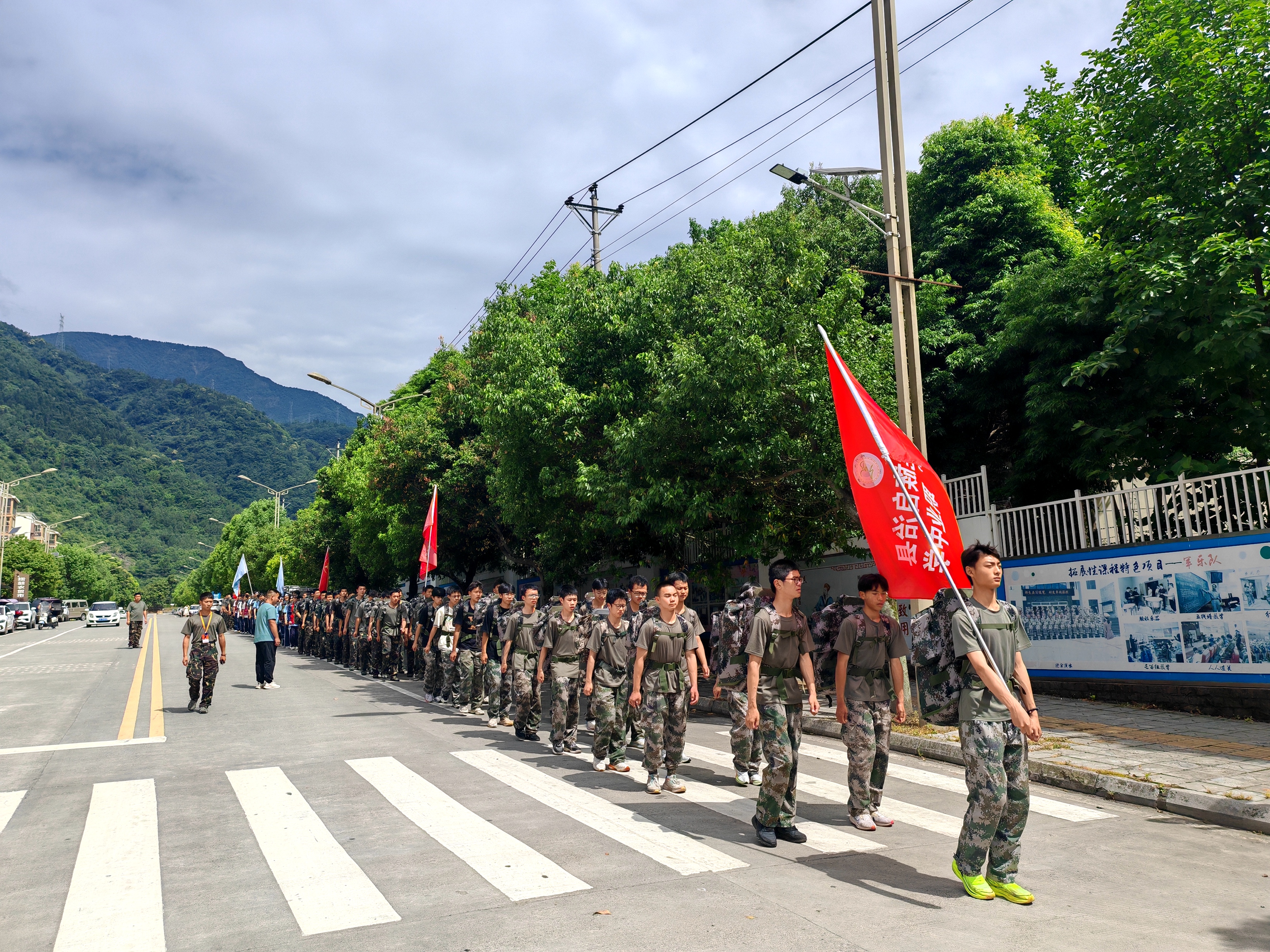 全體師生精神抖擻,邁著鏗鏘有力的步伐,向目的地挺進。一路上,綠色的迷彩綿延成一條長龍,同學們服從指揮、嚴守紀律、互助友愛,把嘹亮的歌聲和良好的風貌留在了沿途的大街小巷中,也引來沿途人們贊許的目光。