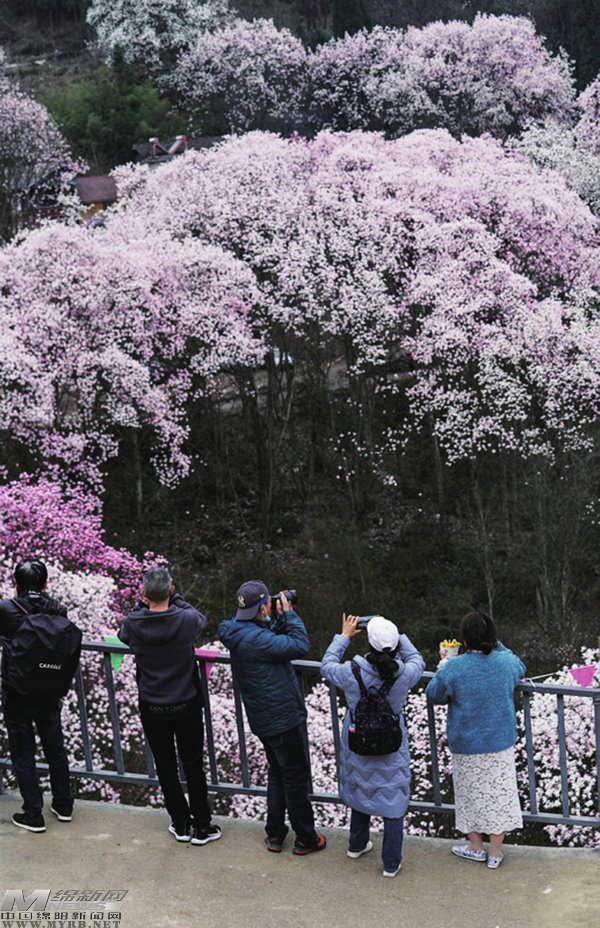 這是3月22日,幾名游客在江油市大康鎮(zhèn)戴天山村觀賞拍攝辛夷花。(新華社記者江宏景攝)