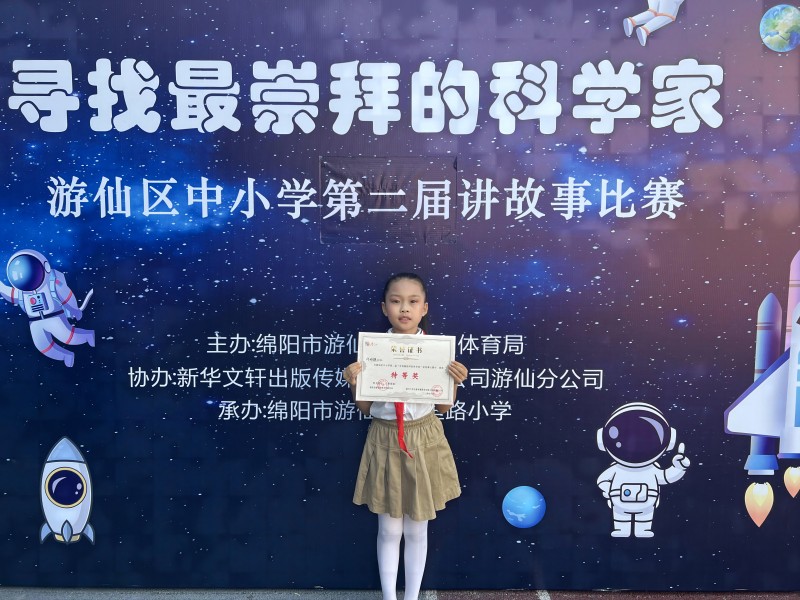 決賽現(xiàn)場,游仙區(qū)劍南路小學三年級二班何姝穎同學以激昂的語調(diào)、生動的案例,講述了時代楷模----南仁東追求真理、勇攀科學高峰的感人故事;分享了這位科學家無私奉獻,為人類進步作出巨大貢獻的感人瞬間。故事飽含對南仁東精神的追求與傳承,激勵在場的每一位評委和觀眾。經(jīng)過激烈角逐,何姝穎同學最終在決賽中拔得頭籌,獲得最高獎項“特等獎”。