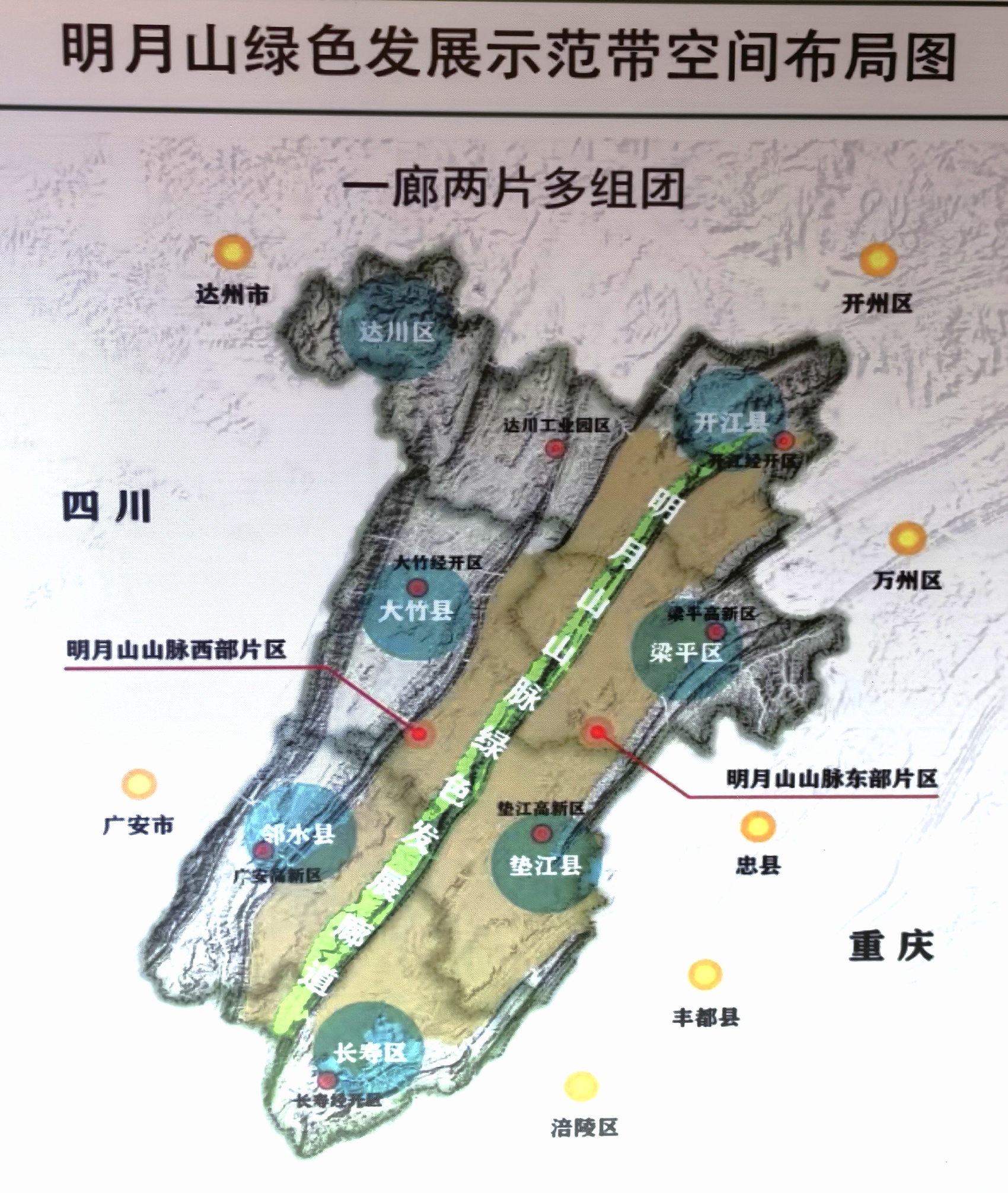 明月山是川東平行嶺谷區(qū)的第三條山脈,東側(cè)、西側(cè)分布著重慶市梁平區(qū)、長壽區(qū)、墊江縣及四川省達(dá)州市達(dá)川區(qū)、開江縣、大竹縣和廣安市鄰水縣共7個(gè)縣(區(qū)),過去由于山巒阻隔,相關(guān)區(qū)縣交流交往并不充分。近年來,作為10個(gè)川渝毗鄰地區(qū)合作共建區(qū)域發(fā)展功能平臺(tái)之一,共建明月山綠色發(fā)展示范帶聚焦綠色一體化制度創(chuàng)新試驗(yàn)田、生態(tài)經(jīng)濟(jì)創(chuàng)新發(fā)展試驗(yàn)區(qū)、人與自然和諧發(fā)展示范區(qū)三大定位,7個(gè)縣(區(qū))簽署各方面協(xié)議110余份,部署落實(shí)119項(xiàng)年度重點(diǎn)任務(wù),協(xié)同發(fā)展效應(yīng)加速顯現(xiàn)。