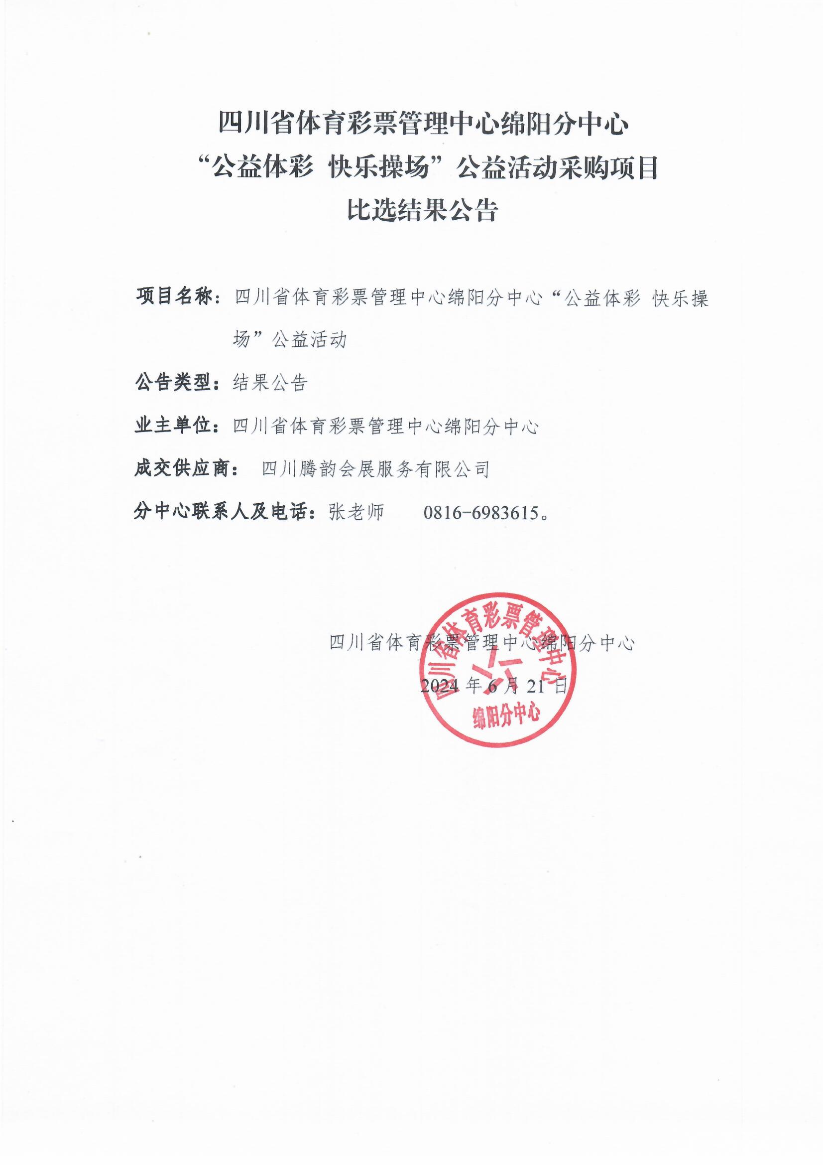 四川省體育彩票管理中心綿陽分中心“公益體彩快樂操場(chǎng)”公益活動(dòng)采購(gòu)項(xiàng)目比選結(jié)果公告