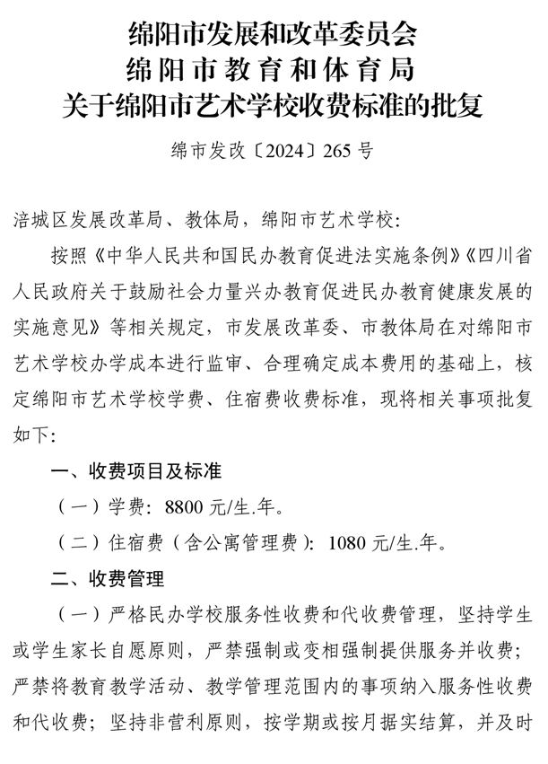 綿陽市發(fā)展和改革委員會(huì)綿陽市教育和體育局關(guān)于綿陽市藝術(shù)學(xué)校收費(fèi)標(biāo)準(zhǔn)的批復(fù)