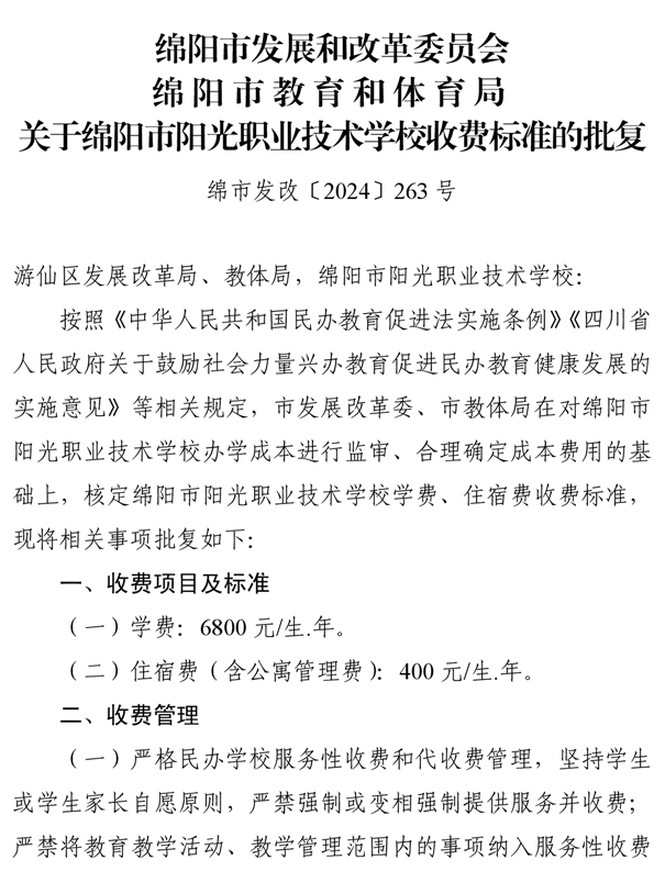 綿陽(yáng)市發(fā)展和改革委員會(huì)綿陽(yáng)市教育和體育局關(guān)于綿陽(yáng)市陽(yáng)光職業(yè)技術(shù)學(xué)校收費(fèi)標(biāo)準(zhǔn)的批復(fù)