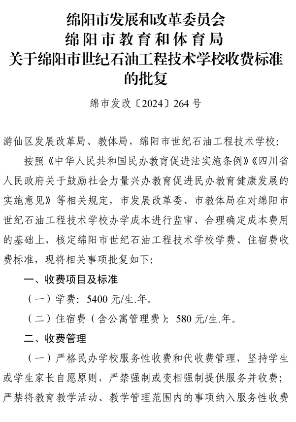 綿陽(yáng)市發(fā)展和改革委員會(huì)綿陽(yáng)市教育和體育局關(guān)于綿陽(yáng)市世紀(jì)石油工程技術(shù)學(xué)校收費(fèi)標(biāo)準(zhǔn)的批復(fù)