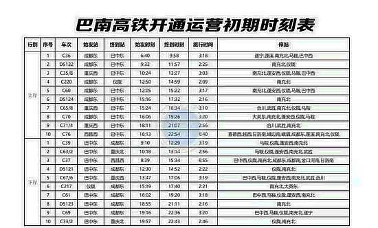 巴南高鐵開通運營初期時刻表 圖據(jù)西南鐵路