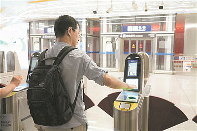 乘客在大興機(jī)場(chǎng)站“刷掌”過(guò)閘。 新華社發(fā)(王靜頤攝)
