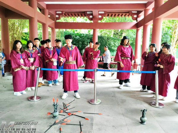 “擊筑落高月,投壺破愁顏……”李白在詩中這樣寫“投壺”游戲。大家分組用小箭矢比賽投壺,了解中國古代六藝之一“射禮”的演變過程,快節(jié)奏又充滿趣味的唐代游戲深受同學(xué)們喜愛。此次研學(xué)活動(dòng)內(nèi)容豐富,氛圍活躍,進(jìn)一步增強(qiáng)了海峽兩岸學(xué)子對中國傳統(tǒng)文化的認(rèn)同感和自豪感。