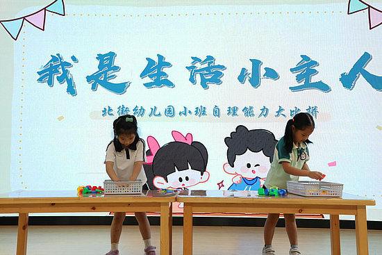 比拼現(xiàn)場,每組兩名參賽幼兒坐在椅子上,等主持人口令發(fā)出后,孩子們迅速行動起來,穿鞋子,穿衣服,疊褲子……專注的神情和熟練的動作贏得現(xiàn)場此起彼伏的加油聲。小朋友們面對色彩、形狀混合的玩具,展現(xiàn)出了極強的觀察力,很快便將玩具收納的整整齊齊。