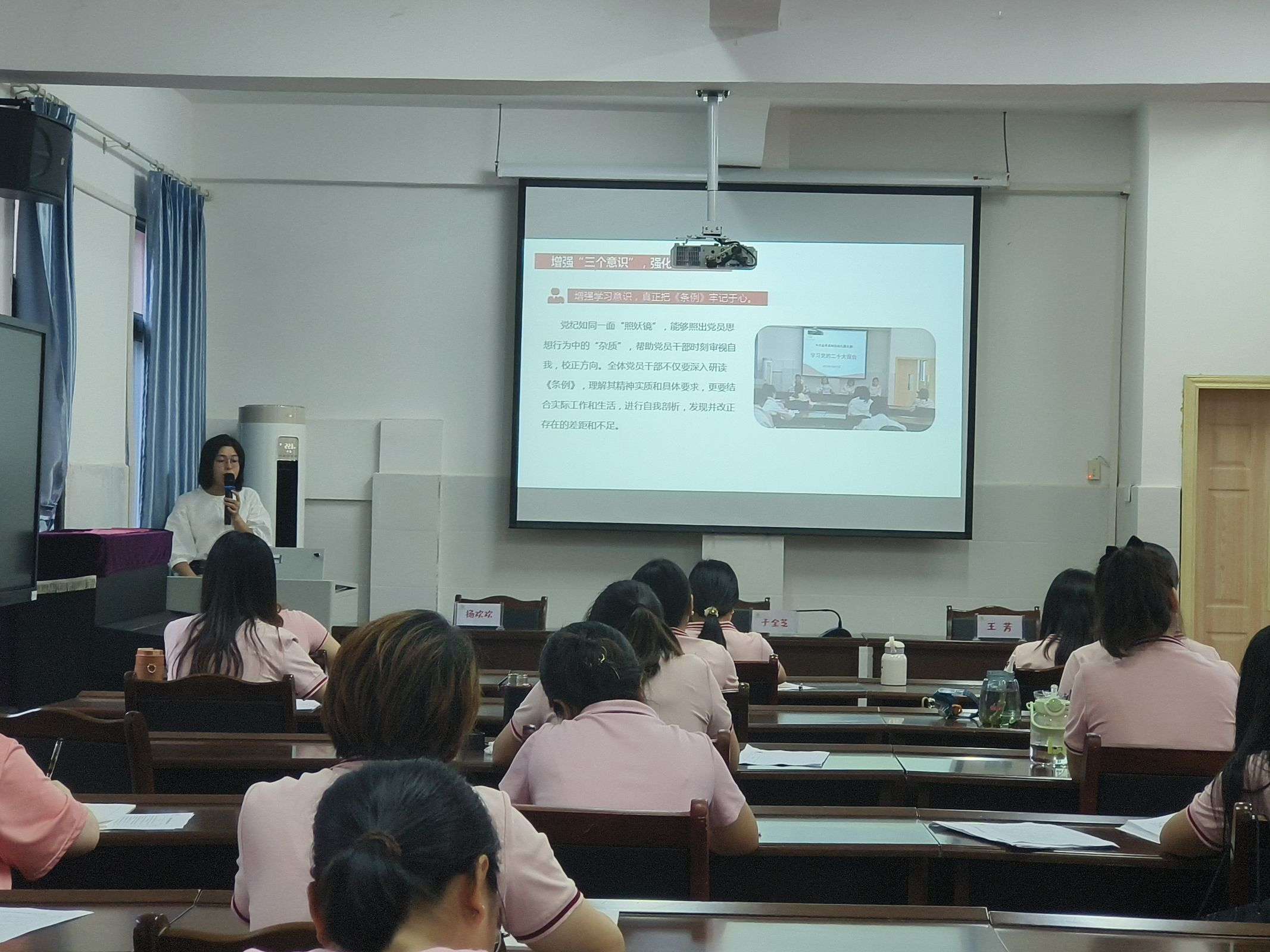 開班儀式上,中共鹽亭縣岐伯幼兒園黨支部書記、園長于全芝以“深入開展黨紀學習教育”為主題對全體教職工上黨課。工會主席楊曉燕老師帶領教師再次學習《新時代幼兒園教師職業(yè)行為十項準則》,要求老師們嚴格自我約束、規(guī)范職業(yè)行為、加強自身修養(yǎng)。