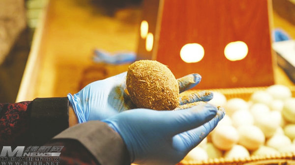 杜志華一邊娓娓道來,一邊熟練包蛋,運(yùn)料快而均勻、手法輕而細(xì)致,轉(zhuǎn)瞬間,一枚均勻穿上粗樸谷殼外衣的皮蛋呈現(xiàn)于眼前。