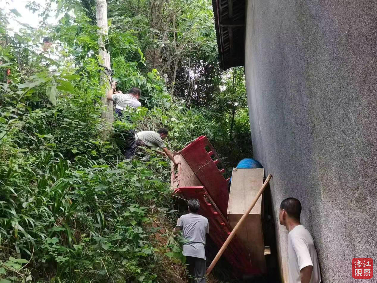 “當(dāng)時趕到的時候發(fā)現(xiàn)他車輛油箱受損了正在漏油,情況相當(dāng)緊急,我馬上招呼周圍吸煙的人不要往中間靠,怕引起爆燃。此外受困司機很激動,村民們就陪他聊天,疏導(dǎo)他的情緒,避免他由于情緒激動、呼吸急促造成缺氧。村民們陸續(xù)回家拿來鋤頭、鋼釬、繩子等工具,齊心合力把車子往上面抬。”新光村村民蔣金瀚回憶道。