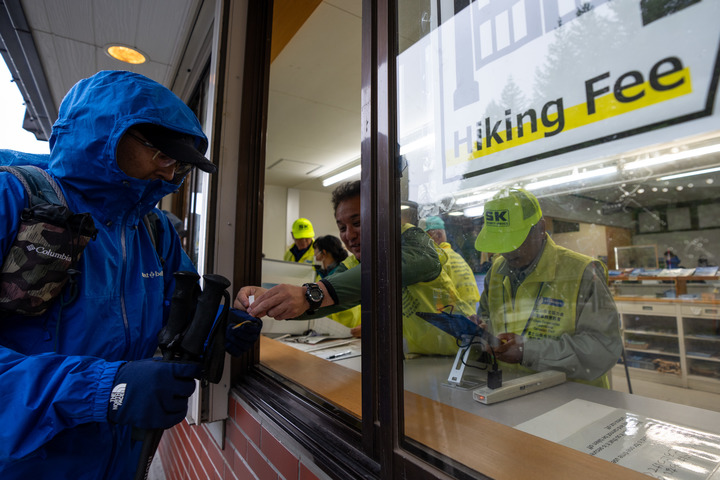 7月1日,在日本山梨縣富士山吉田路線五合目登山口購票處,工作人員為游客戴上象征已支付登山通行費的腕帶。新華社記者張笑宇攝