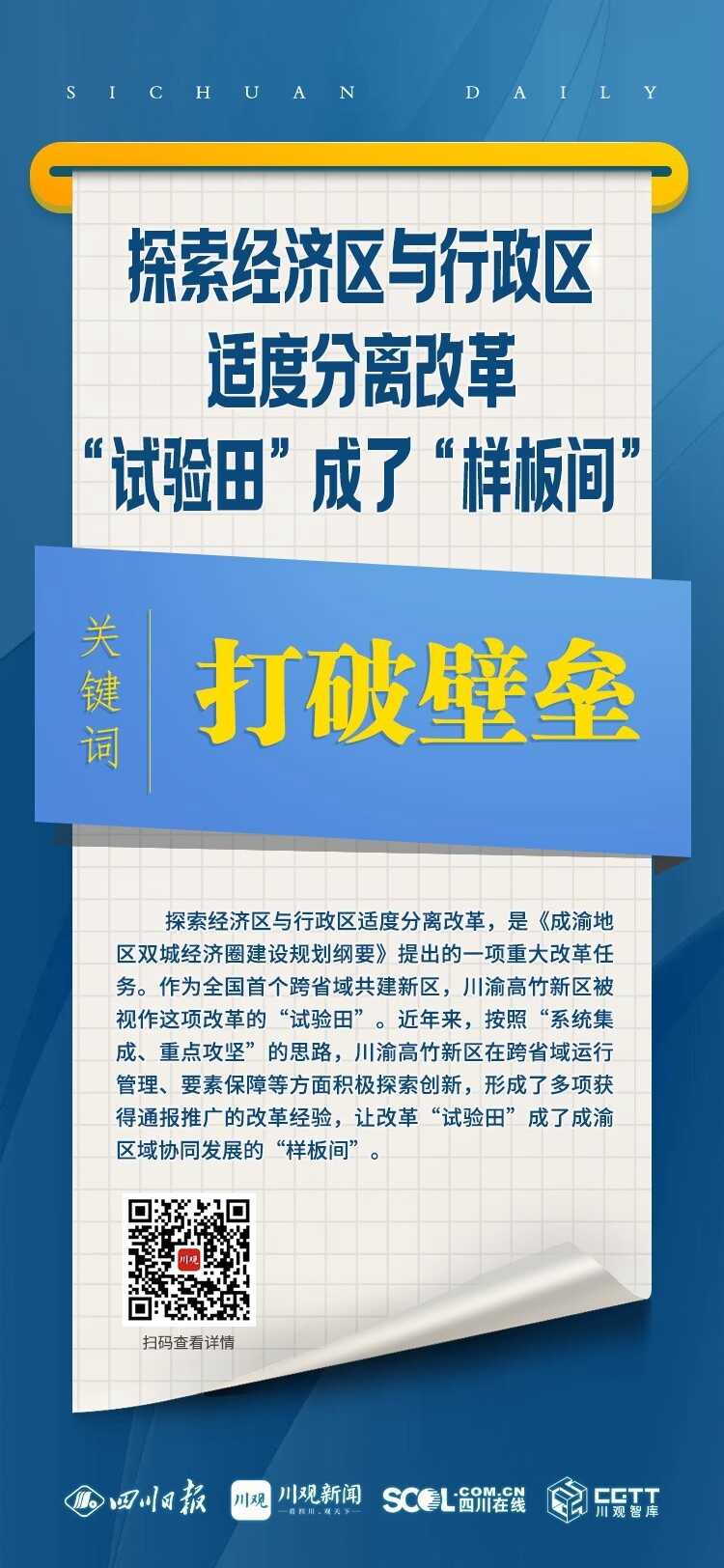 探索經濟區(qū)與行政區(qū)適度分離改革,是《成渝地區(qū)雙城經濟圈建設規(guī)劃綱要》提出的一項重大改革任務。作為全國首個跨省域共建新區(qū),川渝高竹新區(qū)被視作這項改革的“試驗田”。近年來,按照“系統(tǒng)集成、重點攻堅”的思路,川渝高竹新區(qū)在跨省域運行管理、要素保障等方面積極探索創(chuàng)新,形成了多項獲得通報推廣的改革經驗,讓改革“試驗田”成了區(qū)域協同發(fā)展的“樣板間”。