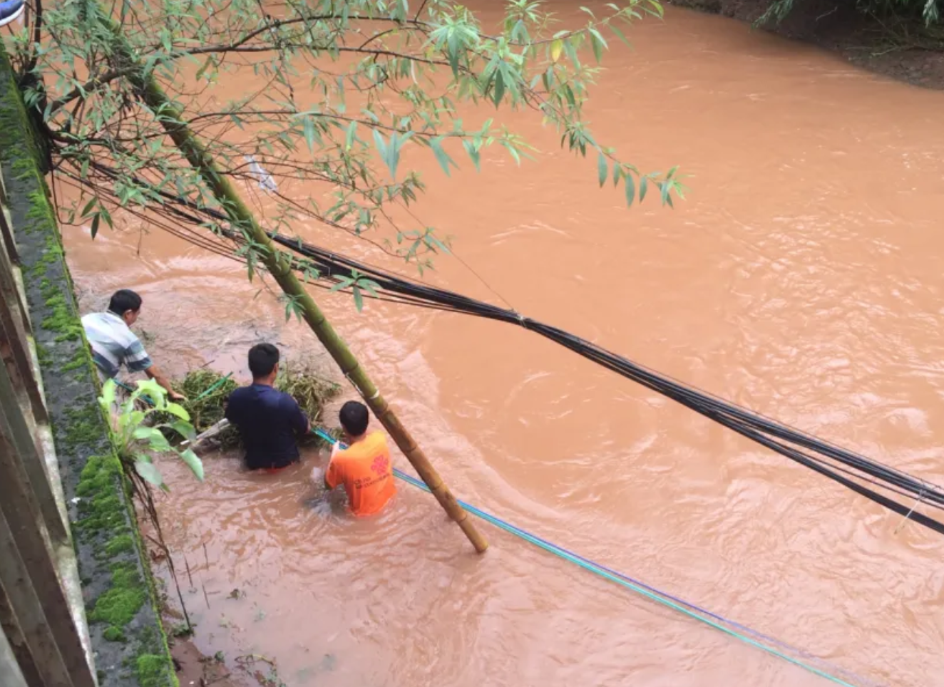 雅安聯(lián)通應(yīng)急通信保障人員在澇災(zāi)中搶修光纜