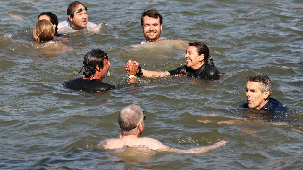 7月17日,巴黎市長(zhǎng)伊達(dá)爾戈(中右)在塞納河里游泳。新華社記者 高靜 攝