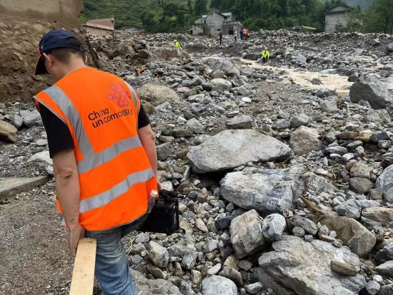 面對道路中斷、車輛無法通行的情況,應急搶險人員通過“手提、肩扛、人抬”的方式攜帶光纜、基站、發(fā)電機等設備,踏著遍地落石與泥沙徒步深入災區(qū)開展保障。21日10時許,中國聯(lián)通伴隨搶險隊伍在新華村五組開通便攜式衛(wèi)星設備;11時30分許,在新合村開通便攜式衛(wèi)星設備。