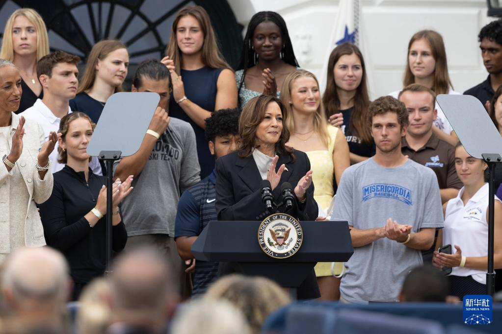 7月22日,美國副總統(tǒng)哈里斯(前中)在美國華盛頓白宮南草坪出席活動。新華社記者 胡友松 攝