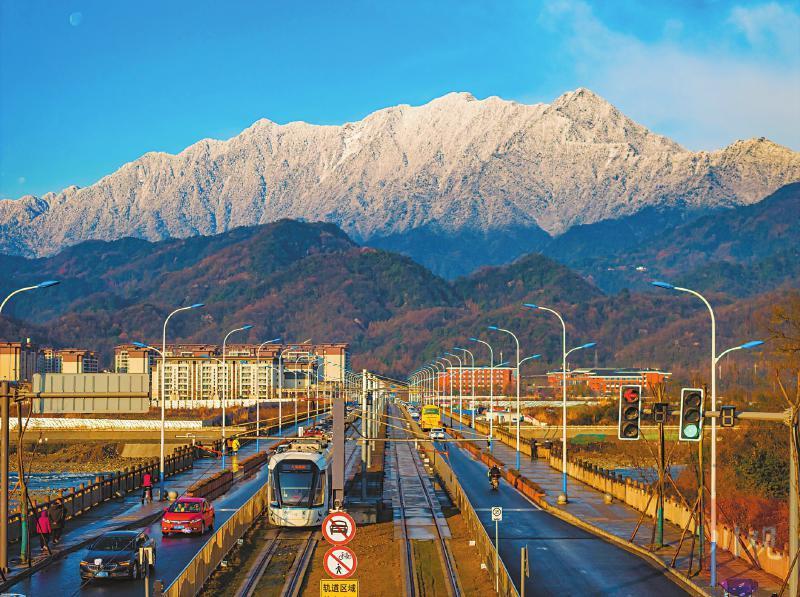 成都都江堰市,一列旅游客運(yùn)專線有軌電車從雪山下的鯉魚(yú)沱大橋通過(guò)。川觀新聞資料圖