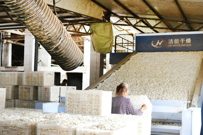 記者隨后在烘干車間看到,一箱箱收購來的蠶繭倒入自動烘干設(shè)備,經(jīng)過履帶傳輸,進(jìn)行工藝烘干處理,現(xiàn)場有條不紊,快捷高效。