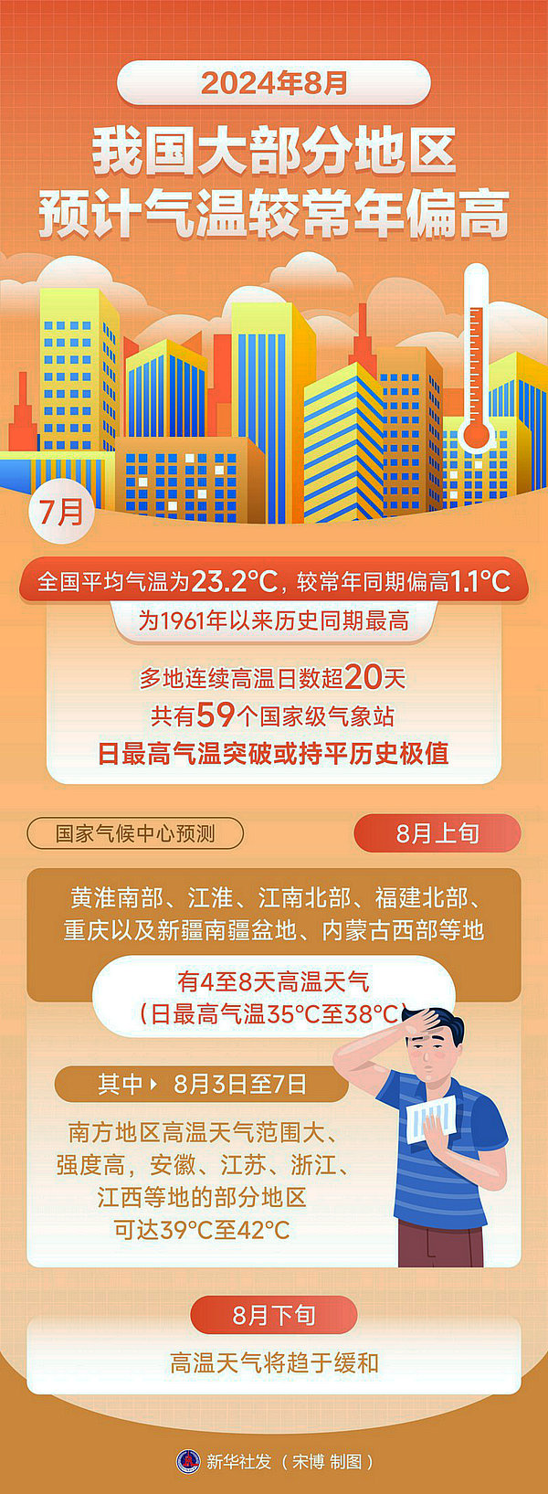 在中國氣象局當(dāng)天舉行的新聞發(fā)布會上,賈小龍介紹,7月,全國平均氣溫為23。2℃,較常年同期偏高1。1℃,為1961年以來歷史同期最高。我國南方遭遇大范圍持續(xù)高溫過程。多地連續(xù)高溫日數(shù)超20天,共有59個國家級氣象站日最高氣溫突破或持平歷史極值。7月22日至23日,35℃及以上的高溫覆蓋面積均超過200萬平方公里。