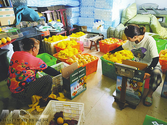 近日,記者走進石廟村的桃園,郁郁蔥蔥的桃樹枝繁葉茂,一個個黃桃掛滿枝頭,村民們穿梭其間,忙著摘果、裝筐、搬運,一派繁忙熱鬧的景象。另一邊的分揀處,大家忙著篩選、包裝、稱重、裝箱(如圖),準備運往周邊酒店銷售。