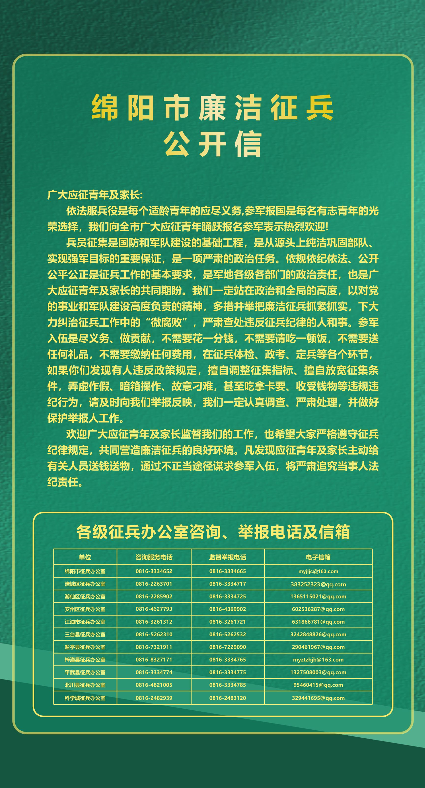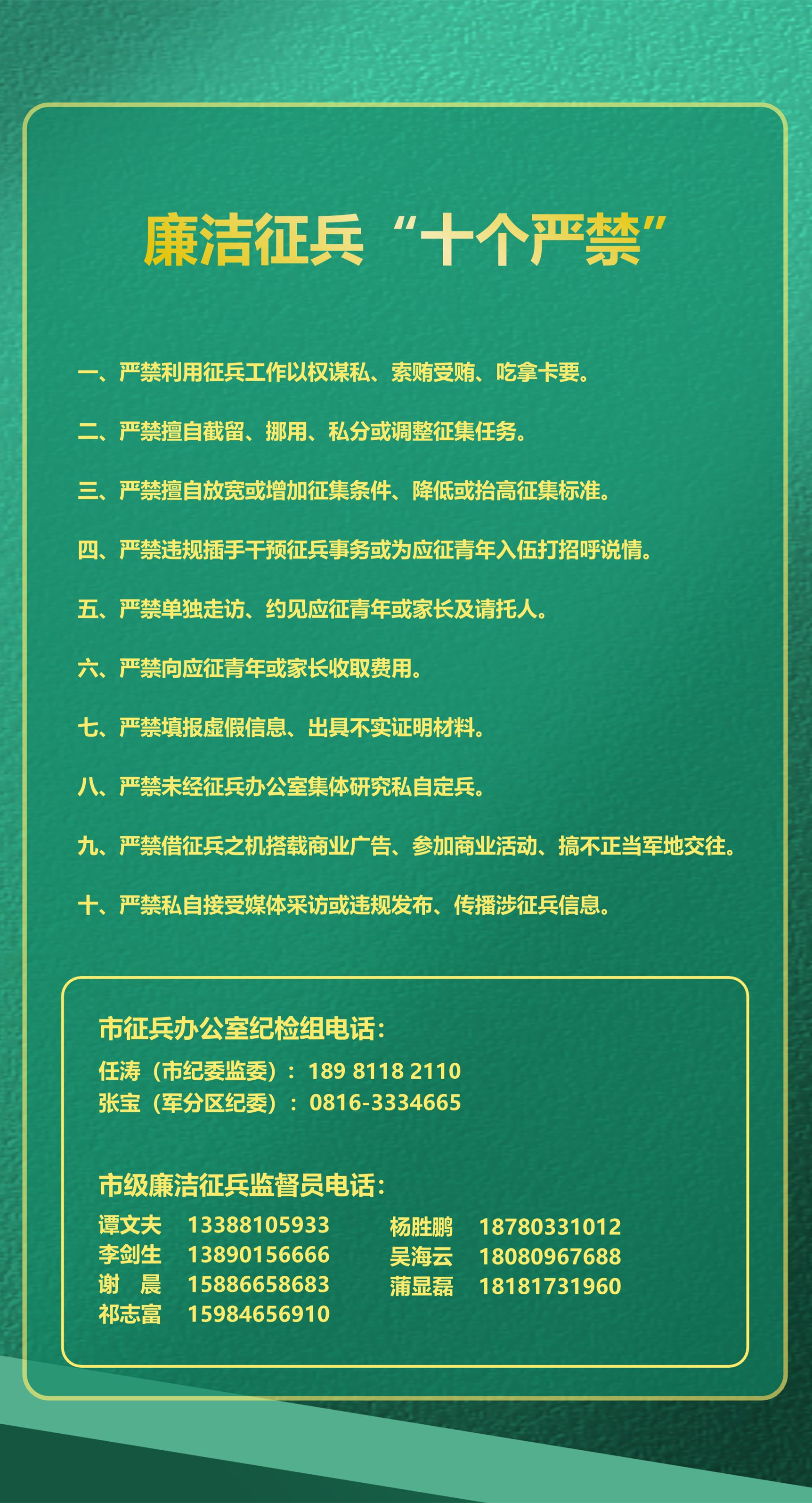 兵員征集是國防和軍隊建設(shè)的基礎(chǔ)工程,是從源頭上純潔鞏固部隊、實現(xiàn)強(qiáng)軍目標(biāo)的重要保證,是一項嚴(yán)肅的政治任務(wù)。依規(guī)依紀(jì)依法、公開公平公正是征兵工作的基本要求,是軍地各級各部門的政治責(zé)任,也是廣大應(yīng)征青年及家長的共同期盼。我們一定站在政治和全局的高度,以對黨的事業(yè)和軍隊建設(shè)高度負(fù)責(zé)的精神,多措并舉把廉潔征兵抓緊抓實,下大力糾治征兵工作中的“微腐敗”,嚴(yán)肅查處違反征兵紀(jì)律的人和事。參軍入伍是盡義務(wù)、做貢獻(xiàn),不需要花一分錢,不需要請吃一頓飯,不需要送任何禮品,不需要繳納任何費(fèi)用,在征兵體檢、政考、定兵等各個環(huán)節(jié),如果你們發(fā)現(xiàn)有人違反政策規(guī)定,擅自調(diào)整征集指標(biāo)、擅自放寬征集條件,弄虛作假、暗箱操作、故意刁難,甚至吃拿卡要、收受錢物等違規(guī)違紀(jì)行為,請及時向我們舉報反映,我們一定認(rèn)真調(diào)查、嚴(yán)肅處理,并做好保護(hù)舉報人工作。