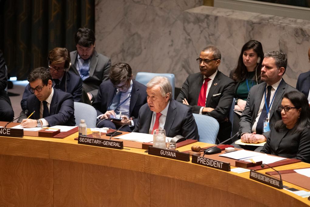 2月23日,在位于紐約的聯(lián)合國總部,聯(lián)合國秘書長古特雷斯(前排中)在烏克蘭問題高級別公開會(huì)上發(fā)言。烏克蘭危機(jī)升級兩周年之際,聯(lián)合國安理會(huì)23日舉行烏克蘭問題高級別公開會(huì),與會(huì)多方呼吁通過政治手段解決烏克蘭危機(jī)。新華社記者謝鍔攝