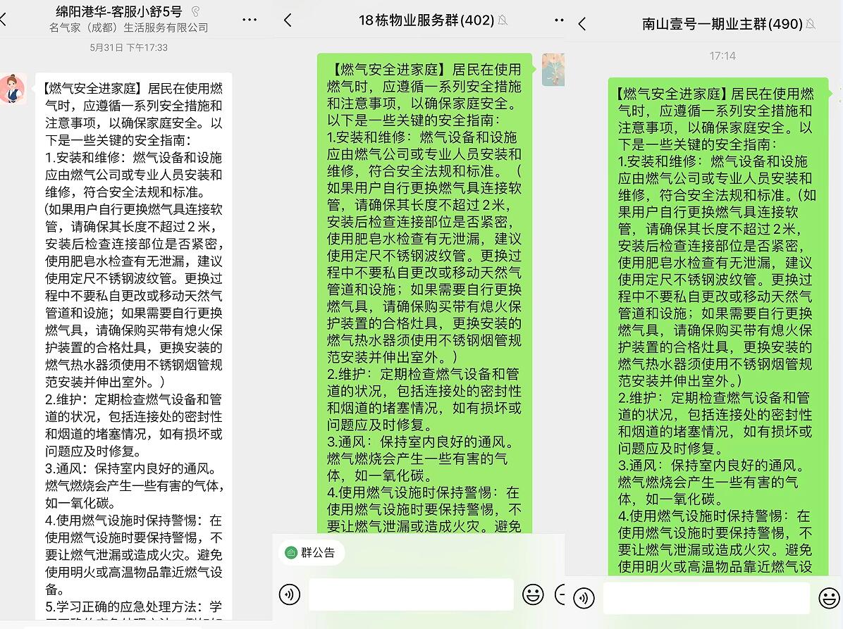 此外,綿陽港華還與物業(yè)管理公司開展燃氣安全共建共治,利用物業(yè)公司的管理平臺,定期向業(yè)主發(fā)布燃氣安全提示,提醒業(yè)主關(guān)注燃氣使用安全。同時,攜手物業(yè)公司共同開展安全隱患排查工作,杜絕用戶私改私接、違規(guī)用氣等危險行為。
