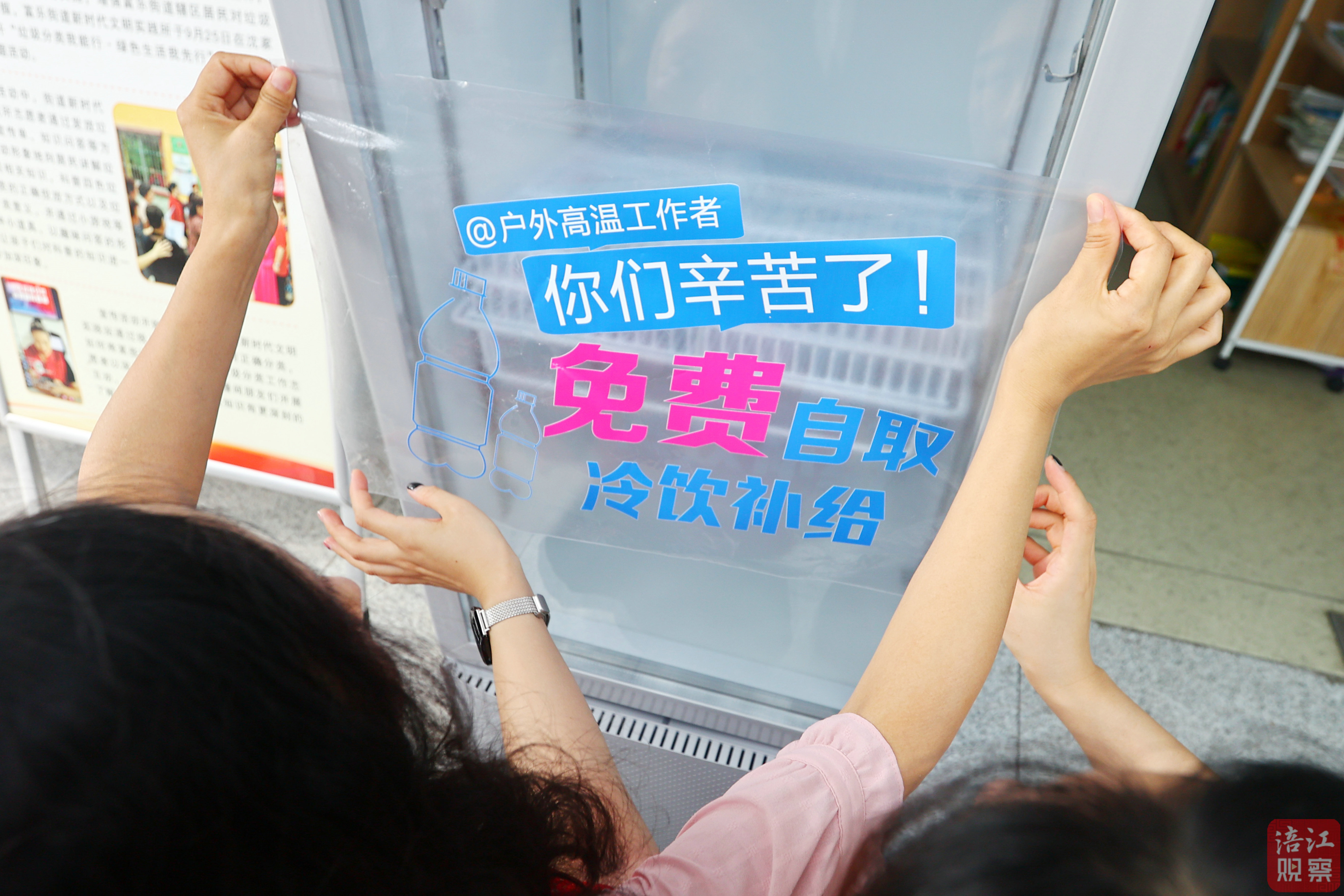 15日上午9時(shí),在游仙區(qū)東津路富樂(lè)街道新時(shí)代文明實(shí)踐所外,數(shù)名志愿者及涪江觀察工作人員開(kāi)始了對(duì)“涪寶愛(ài)心冰柜”的安裝工作。選定合適位置、接駁好電源后,一箱箱礦泉水被整齊地放入冰柜中。工作人員隨后在冰柜上張貼上醒目的標(biāo)語(yǔ),上面寫(xiě)著“愛(ài)心同行 清涼一夏”“戶(hù)外高溫工作者 你們辛苦了!”等溫馨話(huà)語(yǔ)。