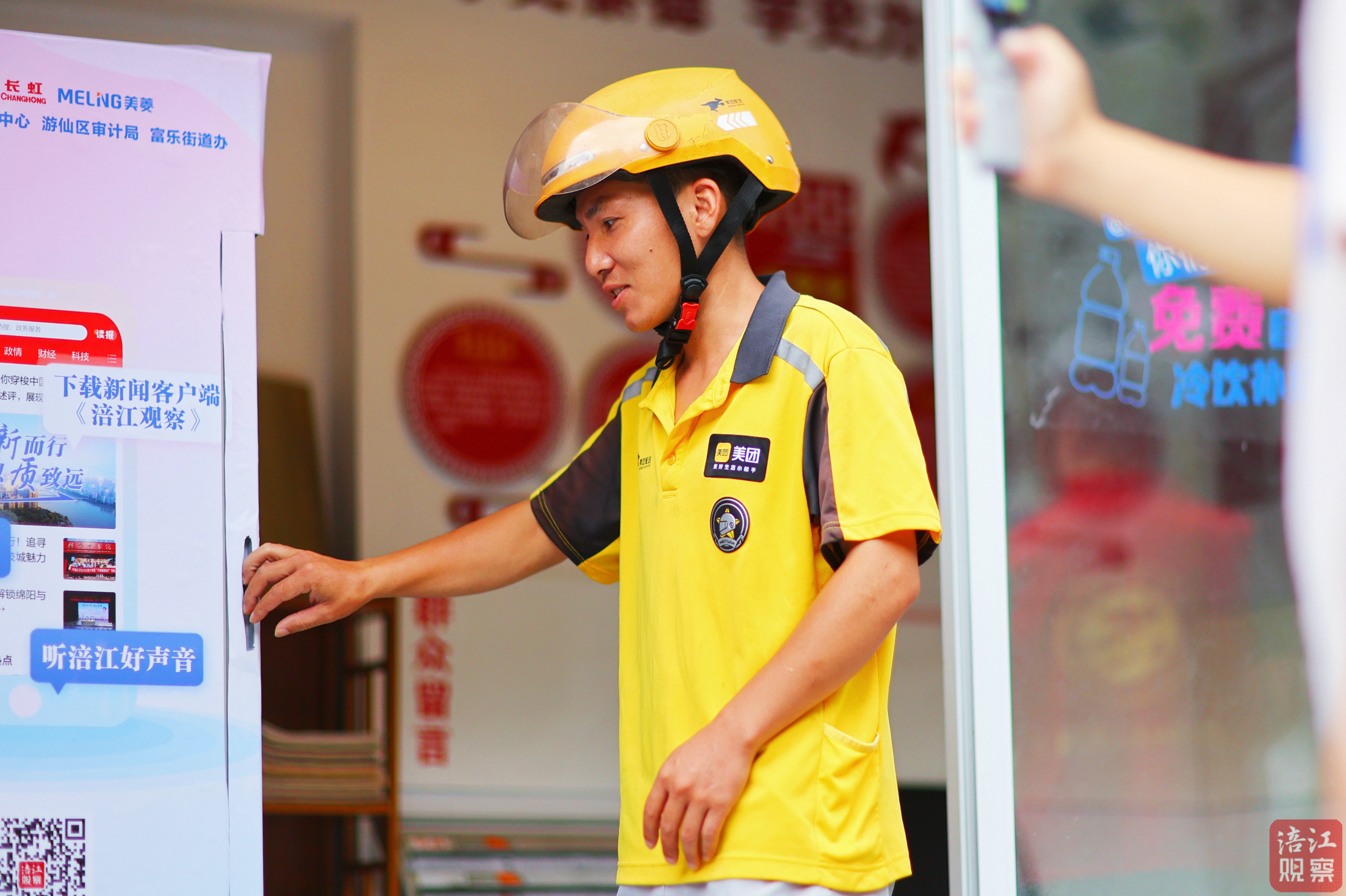 在游仙區(qū)審計(jì)局外,路過(guò)的外賣(mài)小哥黃斌看到了“涪寶愛(ài)心冰柜”,得知可以免費(fèi)取用后,他拿出一瓶冰水大口喝了起來(lái)。