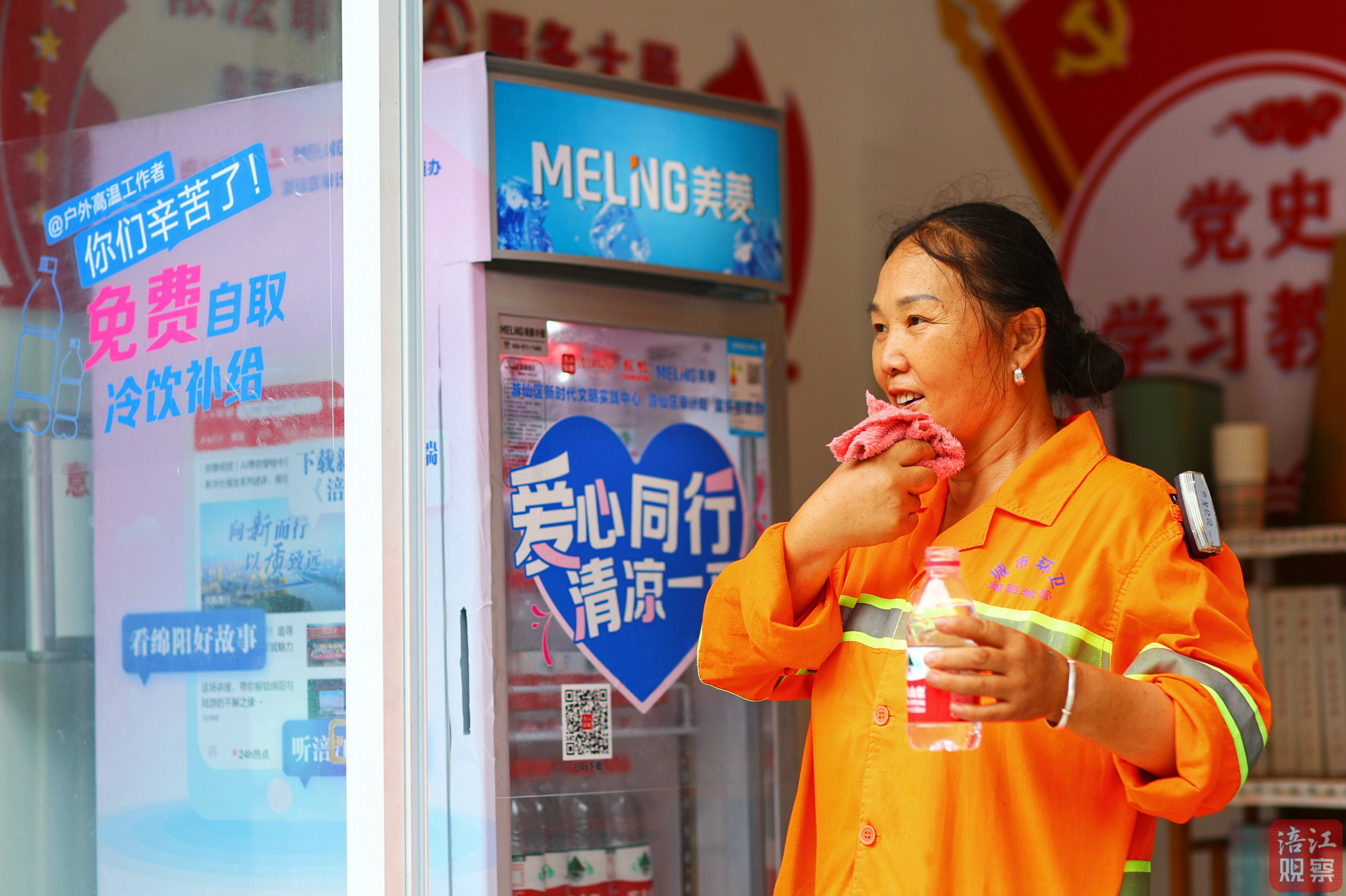 記者了解到,目前投運(yùn)的5臺(tái)“涪寶愛(ài)心冰柜”經(jīng)過(guò)嚴(yán)格選址,均設(shè)置在人流密集的街頭,向環(huán)衛(wèi)工人、建筑工人、快遞員、外賣(mài)小哥、一線干警等戶(hù)外工作者提供免費(fèi)的冷飲。