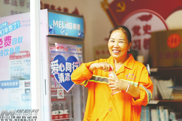 在游仙區(qū)審計(jì)局外,路過的外賣小哥黃斌看到了“涪寶愛心冰柜”,得知可以免費(fèi)取用后,他拿出一瓶冰水大口喝了起來。