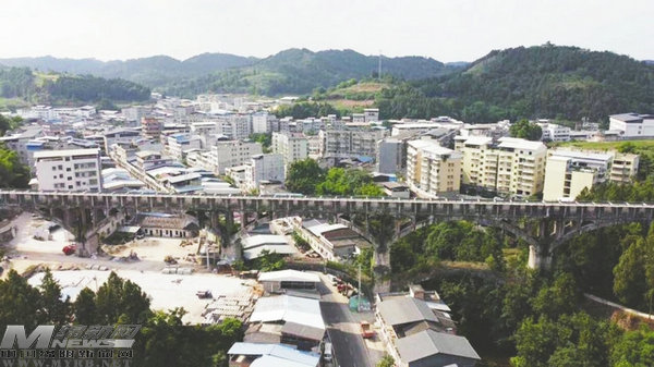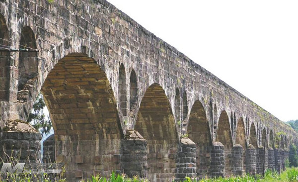 這座渡槽為漿體石拱構(gòu)造,采用排架式石墩基座,共36跨,槽身長、拱數(shù)多、跨度大,成就了渡槽魁偉浩大的建筑造型。記者穿行在橋墩下,看到一塊塊飽經(jīng)歲月風(fēng)霜的石頭,外觀古樸、形制嚴(yán)謹(jǐn),讓人仿佛穿越了時(shí)空。