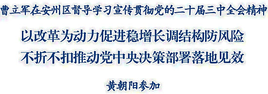 督導(dǎo)期間,曹立軍每到一處都認真聽取學(xué)習(xí)宣傳貫徹黨的二十屆三中全會情況介紹,并向基層干部群眾宣講全會精神。他強調(diào),黨的二十屆三中全會是我們黨的歷史上又一個重要里程碑,是進一步全面深化改革、推進中國式現(xiàn)代化的總動員、總部署,意義重大而深遠。要把學(xué)習(xí)宣傳貫徹全會精神作為當前和今后一個時期全市上下的重大政治任務(wù),精心組織學(xué)習(xí)培訓(xùn),廣泛開展宣傳宣講,切實把思想和行動統(tǒng)一到黨中央大政方針和省委決策部署上來。要高質(zhì)量推進國省重點改革任務(wù)落地,精心謀劃一批符合本地實際的改革舉措,注重發(fā)揮經(jīng)濟體制改革的牽引作用,深化鄉(xiāng)鎮(zhèn)抓產(chǎn)業(yè)促推高質(zhì)量發(fā)展激勵試點、綿州農(nóng)房增信貸、“鎮(zhèn)園合一”等系列自主性改革,統(tǒng)籌推進其他各領(lǐng)域改革,把進一步全面深化改革的戰(zhàn)略部署轉(zhuǎn)化為推進現(xiàn)代化建設(shè)的強大力量。要把學(xué)習(xí)貫徹全會精神與做好當前工作結(jié)合起來,緊緊把握三季度黃金期、窗口期,加強經(jīng)濟運行調(diào)度,全力以赴做好穩(wěn)投資、強產(chǎn)業(yè)、促消費、擴開放等重點工作,不斷鞏固和增強經(jīng)濟持續(xù)向好態(tài)勢,堅定不移完成全年經(jīng)濟社會發(fā)展目標任務(wù),努力為全市發(fā)展大局貢獻更多力量。