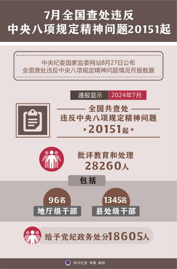 新華社北京8月27日電(記者孫少龍)中央紀(jì)委國家監(jiān)委網(wǎng)站27日公布全國查處違反中央八項規(guī)定精神問題情況月報數(shù)據(jù)。通報顯示,今年7月,全國共查處違反中央八項規(guī)定精神問題20151起,批評教育和處理28260人(包括96名地廳級干部、1345名縣處級干部),給予黨紀(jì)政務(wù)處分18605人。