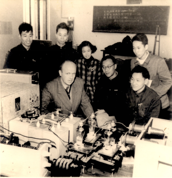 第一張照片的主角是王祖耆教授,該校曾經(jīng)的光電子技術(shù)系系主任。1951年,美國(guó)司法部頒布法令,嚴(yán)禁中國(guó)留學(xué)生離境。年輕的王祖耆牽頭向美國(guó)總統(tǒng)起草公開信,強(qiáng)烈要求美國(guó)撤銷法令。1955年秋,沖破重重阻力,王祖耆與錢學(xué)森同船歸國(guó)。后來(lái),服從國(guó)家分配,籌建成電時(shí),他第一批來(lái)到成都,這張照片就誕生于這段時(shí)期。