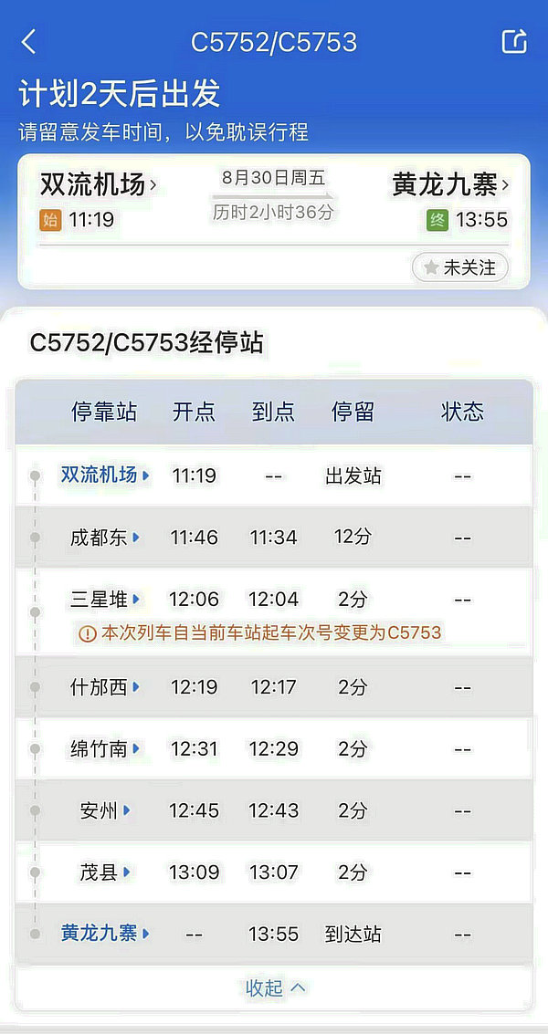 綿陽新聞網(wǎng)訊 8月28日,記者從12306網(wǎng)站時刻表看到,目前四川成都至青海西寧鐵路鎮(zhèn)江關至黃勝關段車次信息已可以查詢,最近的發(fā)車時間為8月30日,成都至黃龍九寨動車用時在兩小時左右,這也意味著成都到黃龍景區(qū)、九寨溝景區(qū)的車程將大大縮短。