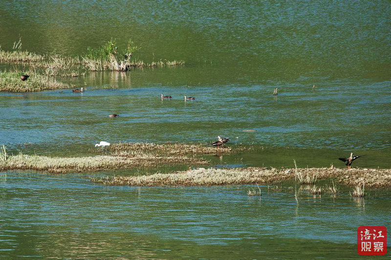 在這里,白鷺、斑嘴鴨、赤麻鴨成為了最靈動的風景線。它們在江畔淺水處悠然自得,或低頭覓食,或展翅高飛,或悠閑地在水里游來游去,像是大自然精心編排的舞蹈,令人賞心悅目。