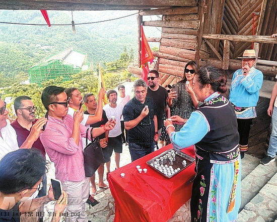 在平武白馬祥述加山寨,白馬藏族姑娘、小伙兒唱起歡快的歌謠,歡迎旅行商代表一行。代表們走進(jìn)民族特色鮮明的農(nóng)特館、民宿,欣賞織花腰帶、攆圓圓帽、鑿曹蓋面具等獨(dú)具民族特色的民俗表演。