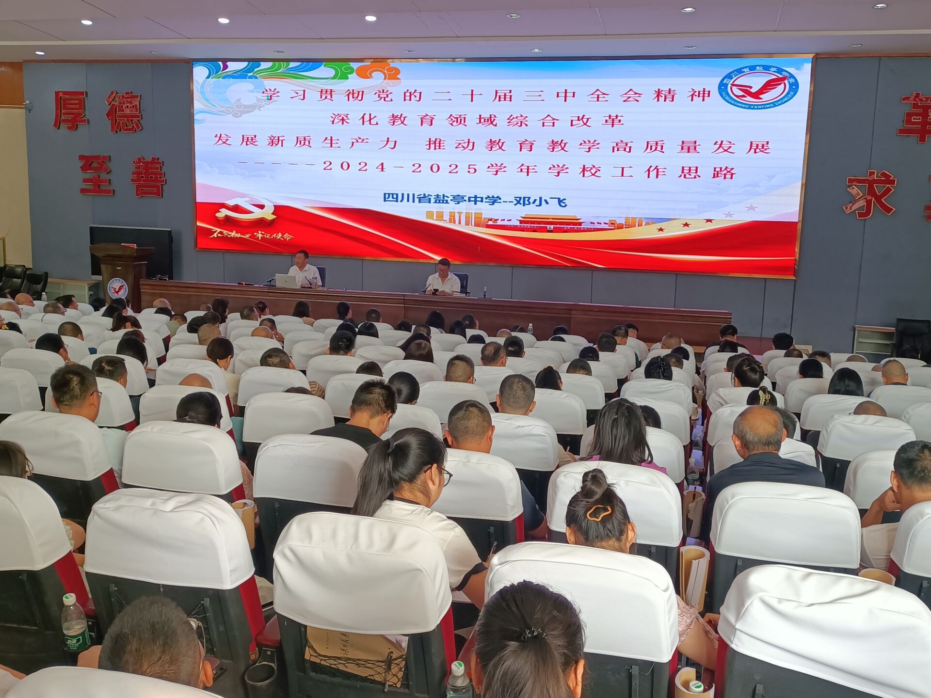 8月28日,鹽亭中學(xué)在校本部學(xué)術(shù)報(bào)告廳召開了以“早謀劃勠力同心,譜新篇踔厲奮發(fā)”為主題的2024年秋季開學(xué)工作會(huì)。包括文同創(chuàng)新實(shí)驗(yàn)校在內(nèi)的全體教職工參加了會(huì)議。會(huì)議由學(xué)校黨委書記張領(lǐng)先主持,校長(zhǎng)鄧小飛作了專題發(fā)言,學(xué)校其他校級(jí)行政領(lǐng)導(dǎo)也先后就自己分管的工作進(jìn)行了安排與部署。
