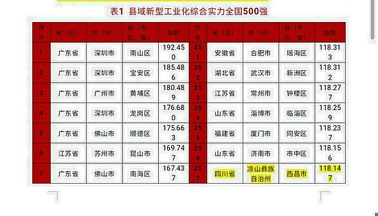 9月2日,賽迪工業(yè)和信息化研究院(集團(tuán))四川有限公司(簡稱“賽迪四川”)發(fā)布《中國縣域新型工業(yè)化指數(shù)研究報告(2024)》。在縣域新型工業(yè)化綜合實力全國500強中,四川共上榜26個縣(市、區(qū)),其中6個市轄區(qū)上榜全國100強。