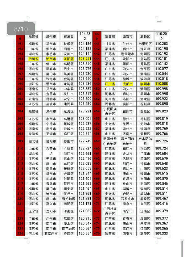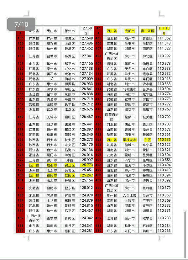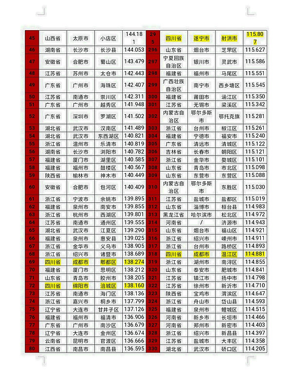 四川上榜的26個縣(市、區(qū))分布在10個地級行政區(qū)劃單位,分別是成都市(上榜全國100強4個、上榜全國500強15個)、綿陽市(上榜全國100強1個、上榜全國500強2個)、德陽市(上榜全國500強2個)、宜賓市(上榜全國100強1個、上榜全國500強1個)、達(dá)州市(上榜全國500強1個)、涼山彝族自治州(上榜全國500強1個)、瀘州市(上榜全國500強1個)、眉山市(上榜全國500強1個)、攀枝花市(上榜全國500強1個)、遂寧市(上榜全國500強1個)。